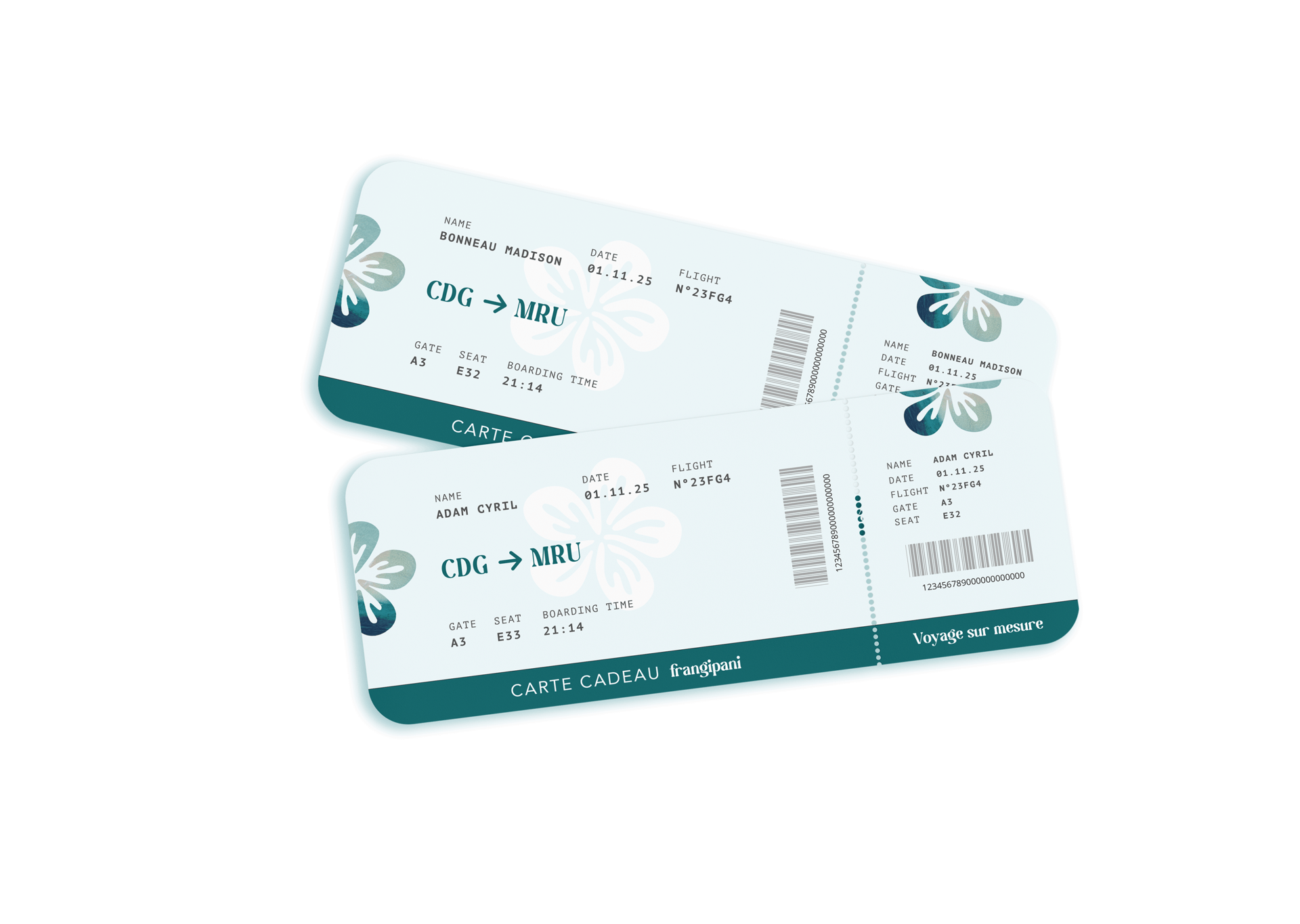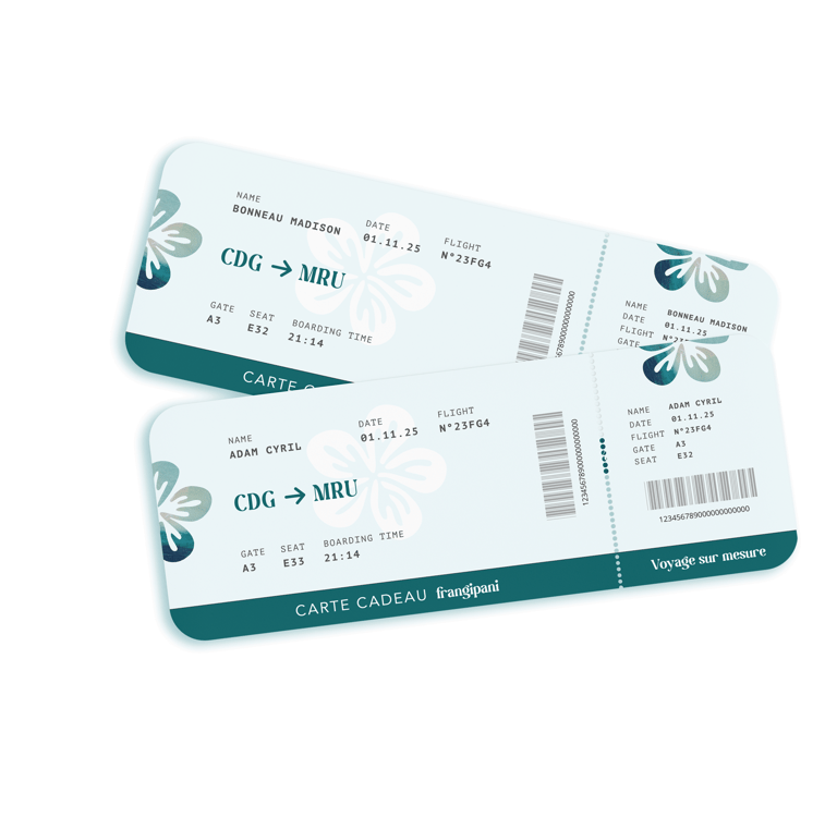Avec la carte cadeau Frangipani sous forme de billet d'✈️, vous invitez vos proches à vivre un voyage sur-mesure, imaginé rien que pour eux.