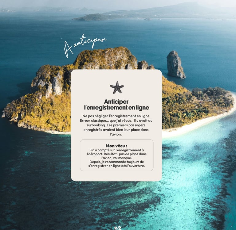 👉 Ce que j’ai appris : s’enregistrer en ligne dès l’ouverture n’est pas une option, c’est une priorité, d’autant plus que certaines compagnies low-cost facturent l’enregistrement s’il n’a pas été fait en amont.