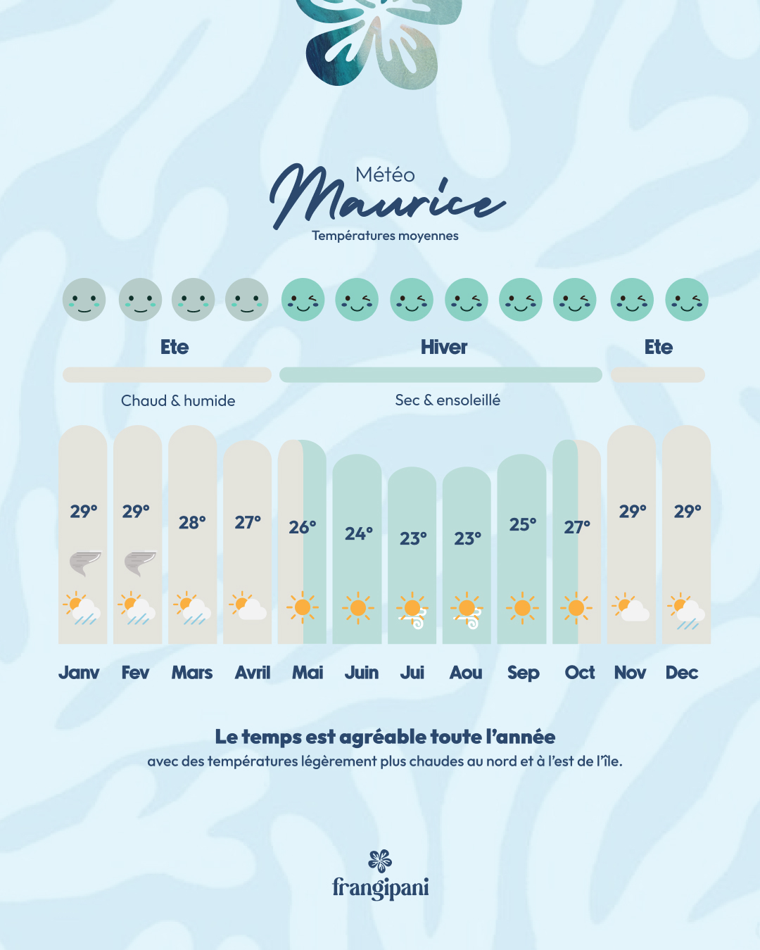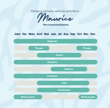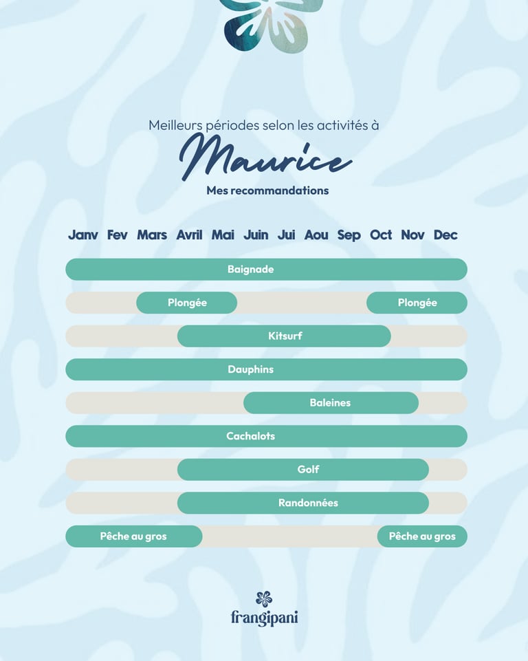 C’est l’objectif de ce visuel : donner une lecture simple des moments les plus agréables pour en profiter. La baignade est possible toute l’année grâce à une mer chaude.