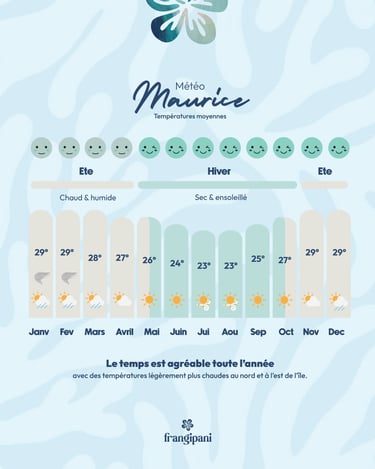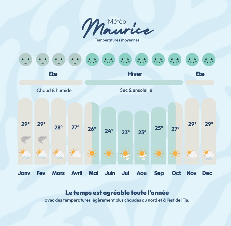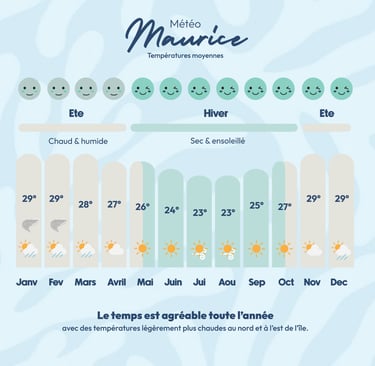 Les températures restent stables toute l’année à Maurice, avec de légères variations selon les mois et les régions.