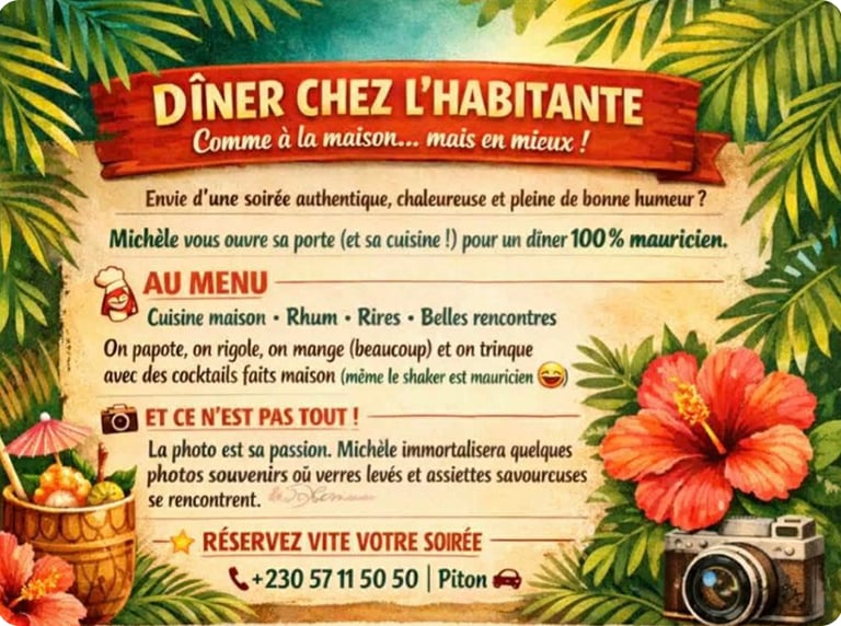 Un dîner chez l’habitant comme à la maison, où l’on découvre la vraie cuisine créole, mais surtout l’âme de Maurice, racontée avec simplicité et chaleur 🇲🇺✨